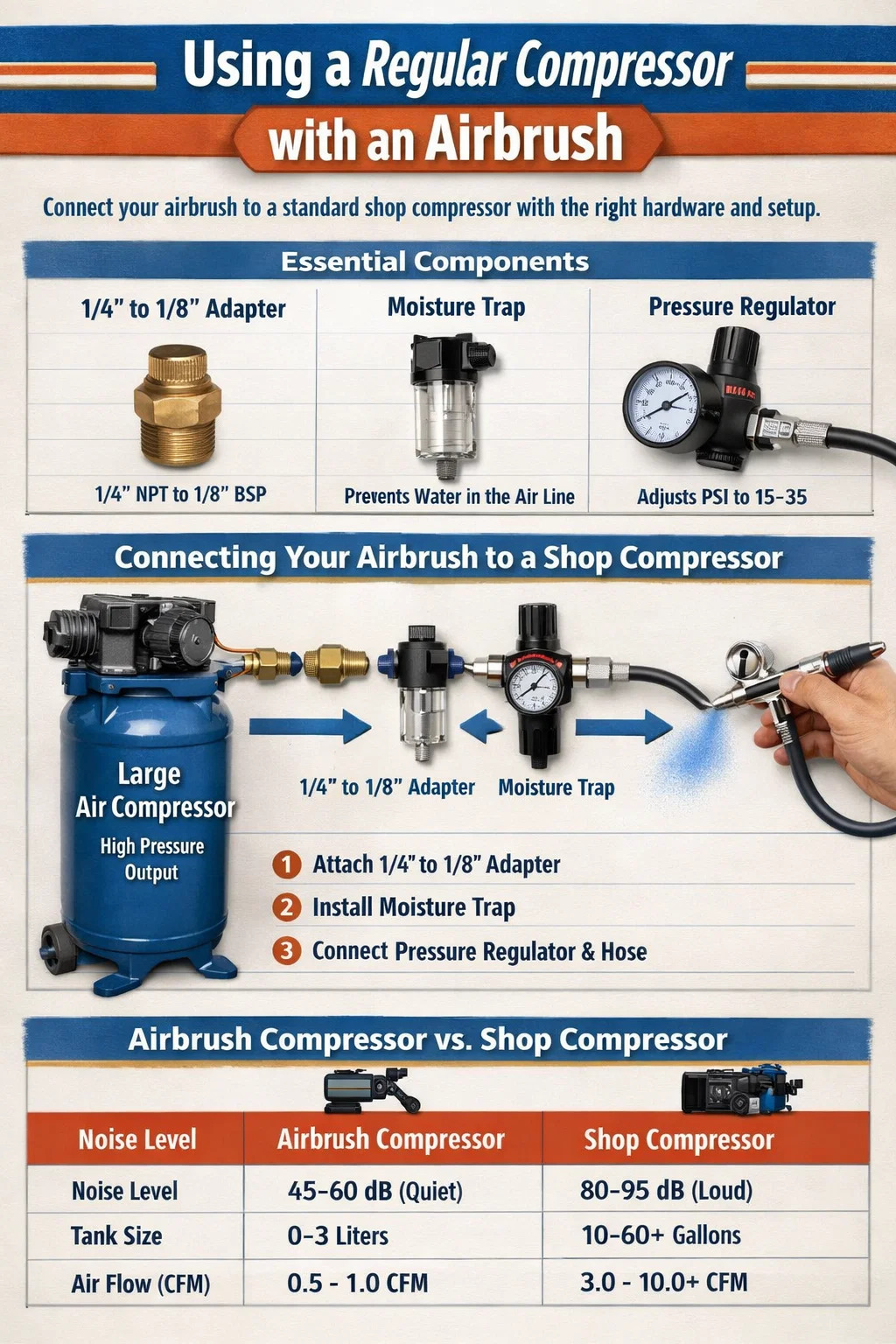 Het grootste risico bij het gebruik van een gewone compressor is de enorme hoeveelheid druk die deze kan genereren. De meeste airbrushslangen zijn alleen geschikt voor tot 50 of 60 PSI . Als uw winkelcompressor is ingesteld op het maximale vermogen (vaak 125-150 PSI), loopt u risico het barsten van de airbrushslang of het beschadigen van de delicate interne afdichtingen van de airbrush zelf.