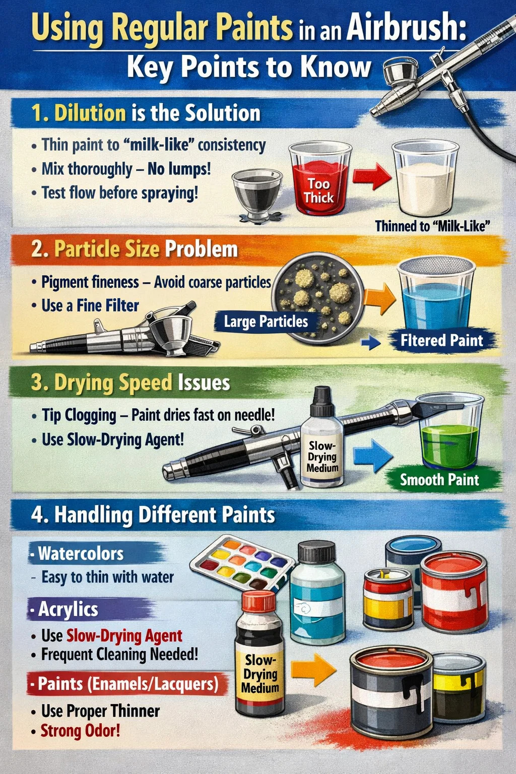 Als u uw gewone verf wilt gebruiken airbrushen , moet u op de volgende belangrijke punten letten: