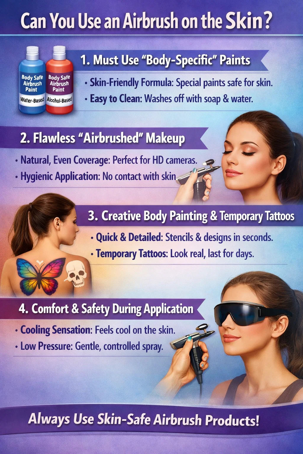 Met behulp van een luchtpenseel op de huid bereikt niet alleen een detailniveau dat ongeëvenaard is bij handmatig aanbrengen, maar creëert ook ongelooflijk realistische visuele effecten. Omdat de huid echter deel uitmaakt van het menselijk lichaam, zijn er enkele zeer belangrijke overwegingen: