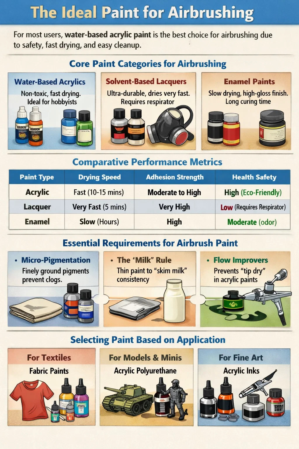 Voor de overgrote meerderheid van de gebruikers is acrylverf op waterbasis is de beste keuze voor airbrushen. Het biedt een optimale balans van niet-giftige veiligheid, snelle droogtijden en eenvoudige reiniging met eenvoudig water of speciale reinigingsmiddelen. Terwijl geavanceerde hobbyisten lakken kunnen gebruiken voor extreme duurzaamheid, acrylverf is de industriestandaard voor algemene illustratie, schaalmodellering en textielwerk vanwege hun veelzijdigheid op verschillende oppervlakken en minimale chemische geur.
